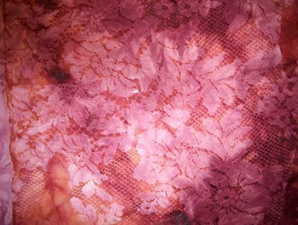 Cotton fabric, that I do believe I compost dyed, osage orange on the gelatin plate with some lace trims gave a nice resist pattern. After curing and washing the osage orange color is about 30% of it's orignal brightness on cotton fabric. Now to find this piece of fabric in my stash and audition some threads for stitching.